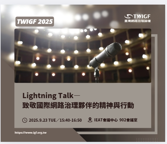 了解更多 >短講時間(Lighteing Talk) —致敬國際網路治理夥伴的精神與行動 在全球網 … Continue reading